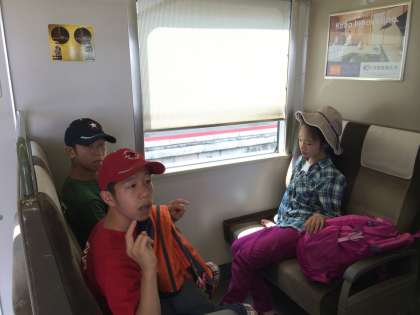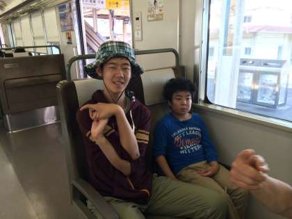 絶好の旅日和! JRに乗り,青空と窓から見える景色を眺めながら琵琶湖博物館,希望ヶ丘へと各グループの目的地に向かっています。