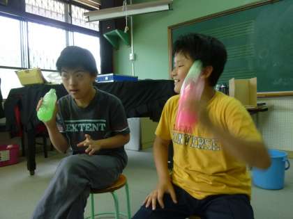 みんな夢中になって、一生懸命ペットボトルを振ってました。