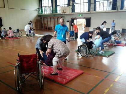 今回は,「身体の動きへの支援,アプローチ」についての講義の後,体育館にて,「車いす操作・介助」についての実技をしていただきました。