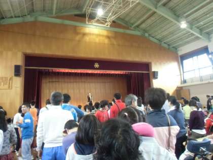 全校集会では,校長先生から「前期の終業式でみんなが頑張ったことをいくつか報告しましたが,後期の終業式にもたくさん報告できたら良いですね。」