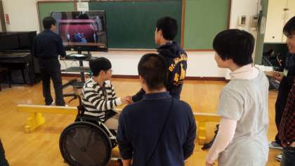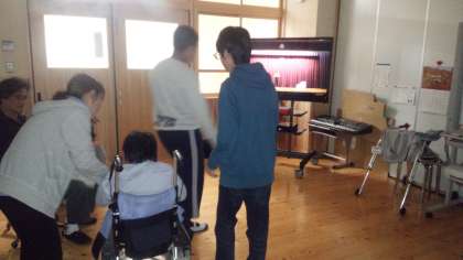 高等部3年生は,昨日,ホームページ「教材作成の紹介(11)」で紹介しました舞台発表のシミュレーションビデオを観ながら舞台練習をしていました。
