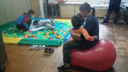 11月6日の「教材作成の様子紹介(11)」で紹介しました小学部1年生の段ボール教材「電車」で,子どもたちが楽しそうに遊んでいました。
