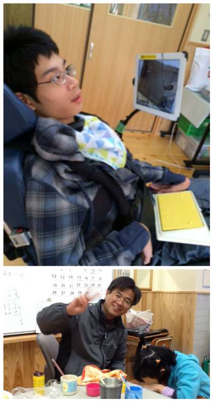 1月30日(金)の研究発表会で,桂坂教育後援会より寄贈して頂いたiPad用のフレキシブルアームやスイッチを使って学習発表をします。友達が学習している様子をiPadで写真撮影し,その写真をみんなで見ながら授業のまとめをします。教室の様子を写真撮影してiPad操作の練習をしました。