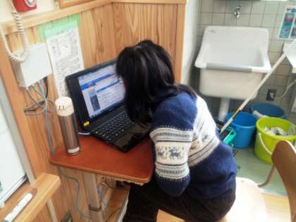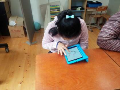 高等部3年生の教室では,iPadで数字のなぞり書きをしていました,その横では,コンピュータでインターネット検索をして,読み上げ機能で読み上げさせ真剣に聞いている生徒がいました。(読み上げ機能は自分で見つけ,操作の仕方を覚えたそうです)