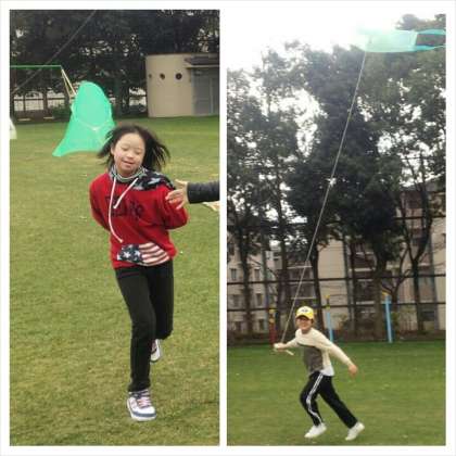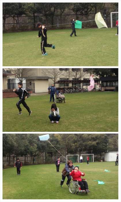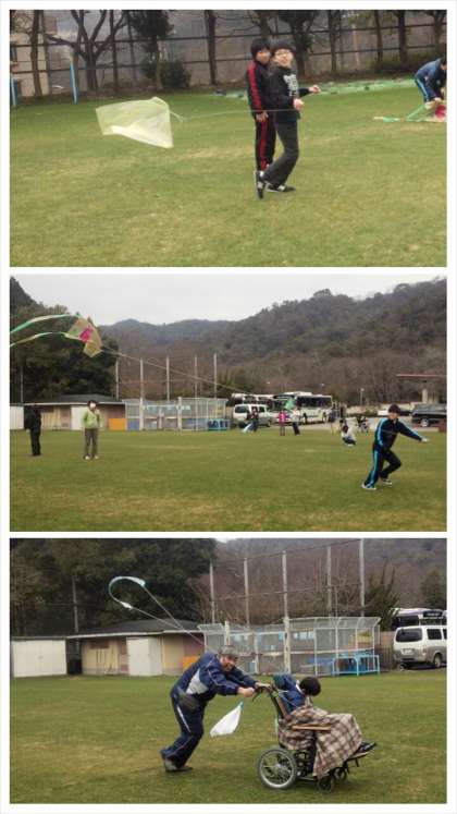 中学部1年生は,手作りのオリジナル凧をグラウンドであげました。