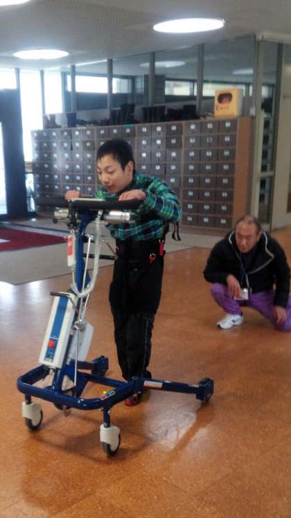 三井相続会記念福祉基金より寄贈していただきましたPOPO(歩行訓練ツール)で,歩行練習をしています。