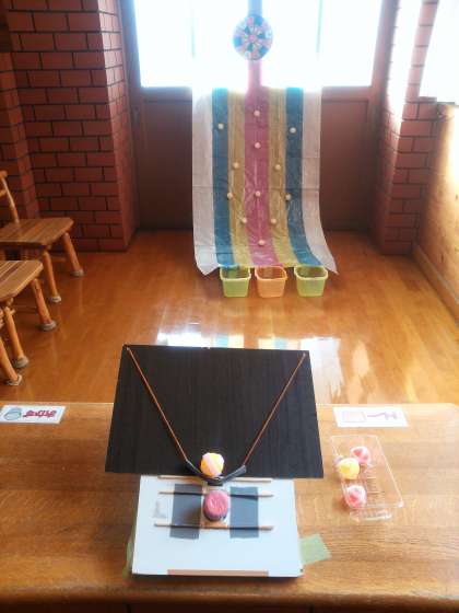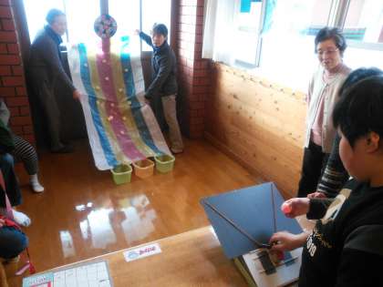 手作りの的あて機と的を作りました。ボールを置いて的を狙ってゲームスタート! みんなとても上手で高得点がたくさん出ました。