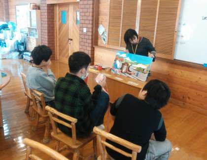 その後は大型絵本の読み聞かせをしました。男の子の大好きなキャラクターだったのでみんな夢中で聞いていました。