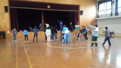 カメラを持って体育へ行ったときは,準備体操のダンスをしていました。ステージの上で踊る代表の友達を見ながら,しっかりと身体を動かしていました。