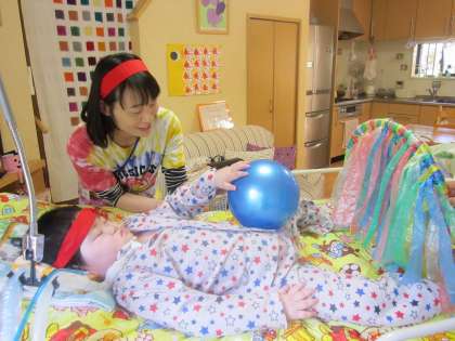 全校ダンスの「Rising Sun」の曲に合わせて全身を揺らしています。肩・腰・膝・足首の下にミニボディボールを入れることで,少しの力で気持ちよく体を揺らすことができます。