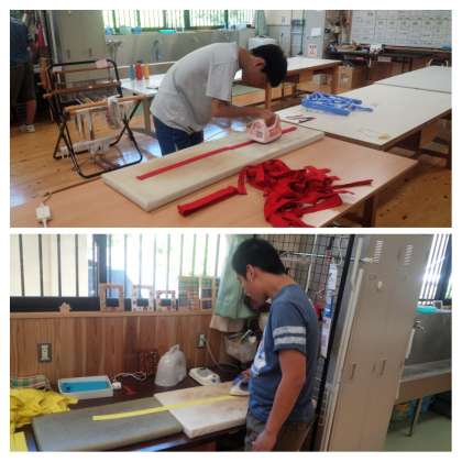 明日,学校祭体育の部のハチマキを返却しなければいけないので,「お掃除・洗濯ユニット」のメンバーはアイロンがけをしていました。
