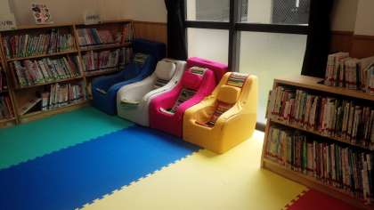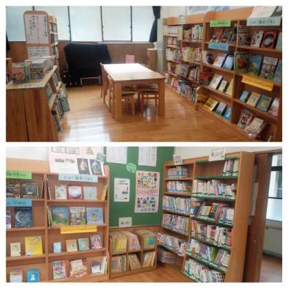 1階中棟の東端にある図書室の紹介です。授業時間の図書室での学習だけでなく,昼休みにも多くの子どもたちが図書室を訪れ読書を楽しんでいます。ゆっくり落ち着いて読書ができるようにテーブルやソファ(?)も置いてあります。