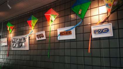 現在は,卒業生の富田晃生さんの作品と,「PARASOPHIA 京都国際現代芸術祭2015」に出展していただいた中学部の凧の作品を展示しています。