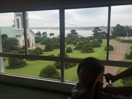 ホテルに着きました。雨は降ってません。明石海峡大橋が見えます。