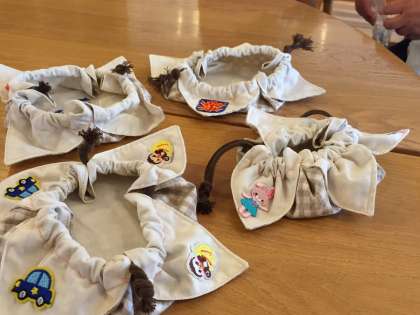 子供と協力してヒモを通して,アップリケをつけて完成です。素敵に出来上がりました。次回からはここにおやつを入れて持ってきます。