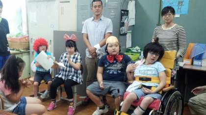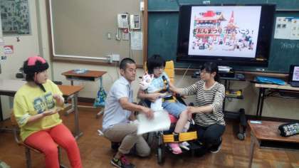 今日は,その事前学習を小学部・中学部 合同で行いました。自己紹介をした後,「お祭り博士」が,インターネットなどで自分で調べた祇園祭について,クイズ形式でみんなに教えてくれました。そして,お祭りのはっぴを着て,うちわを配布する練習をしました。