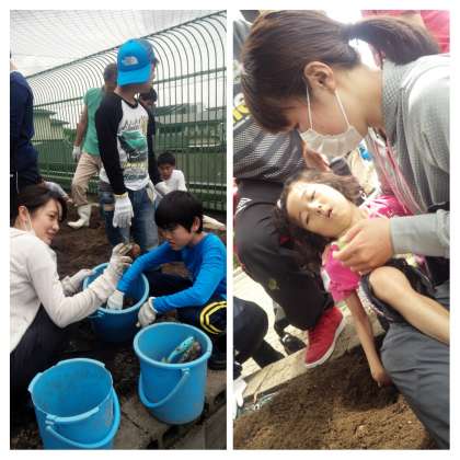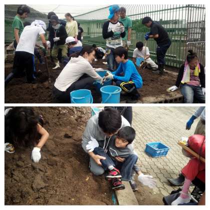 高等部のワークスタディ園芸班の先輩が,じゃがいもを掘りやすいように土をならしてくれたり穴を掘ったりして助けてくれました。