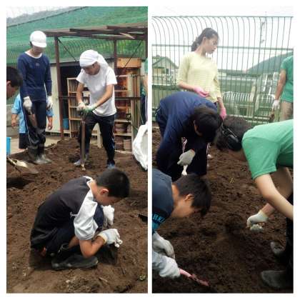中学部1年生は,屋上と南校舎南側の畑でじゃがいも掘りをしました。