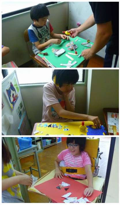 ペットボトルの蓋や広告、ボンド、画用紙、折り紙などさまざまな物を使って作品を作ってみました。
