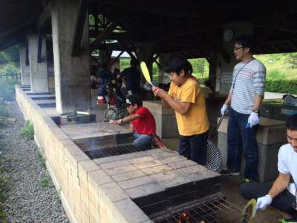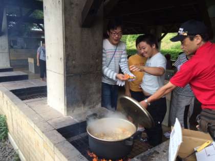 かまど班、調理班、米とぎ班に分かれて順調に野外炊飯を楽しんでいます