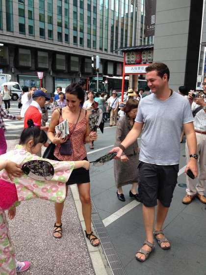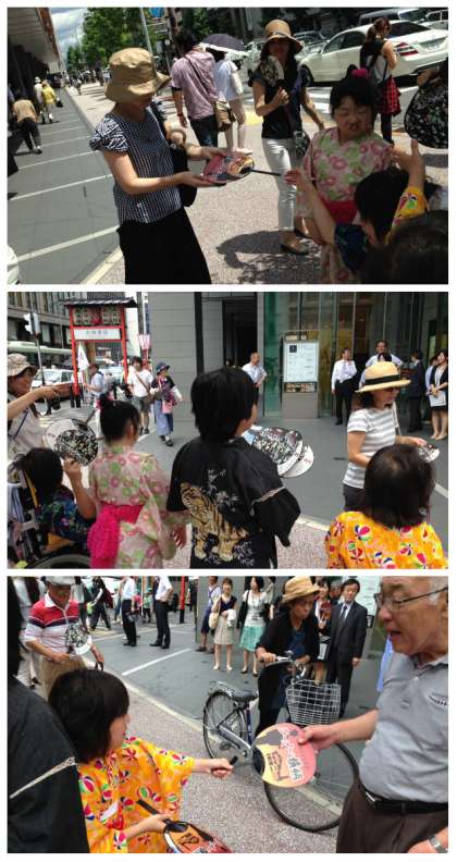 「よろしかったら、どおぞ〜」,「祇園祭のうちわで〜す!」