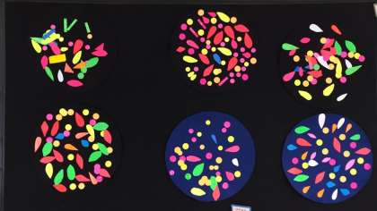 先日の休日参観の日に観ていただきましたが,小学部1年生の教室前廊下に「はなび」の作品が掲示されています。