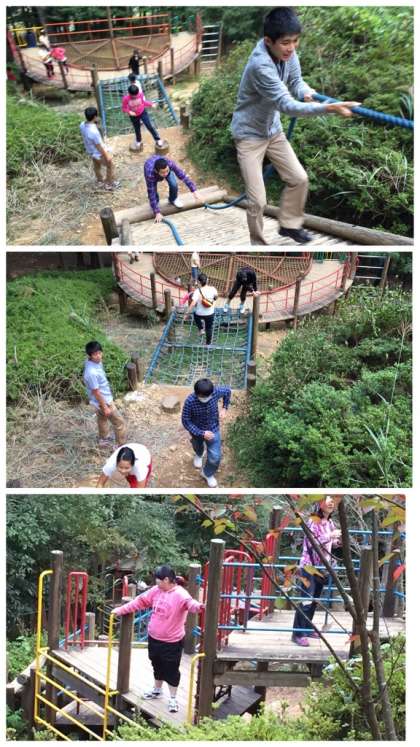 アスレチック班の生徒たちは、遊具を前にして飛び出して行きました。時間があっという間に経ち,「もう終わり?」という感じでしたが,子どもたちの表情は清々しく疲れた様子でした。