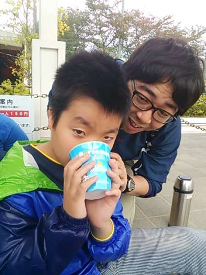 梅小路公園のすざく広場に来ています。しっかりと水分補給をしたら、たくさん遊びたいと思います。