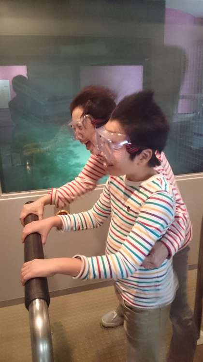 強風体験室では、風速21メートルを体験しました。前屈みになって手すりにつかまってないと立っていられない程でした。