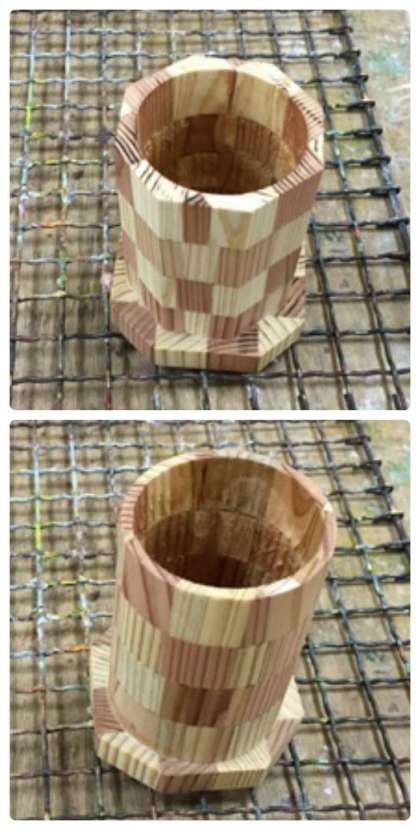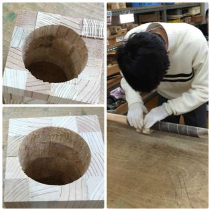 くりぬいた穴にぴったりの太さの木の棒の周りに紙やすりが巻きつけてあります。木の棒に沿ってごしごしすると,穴がきれいに研磨できます。