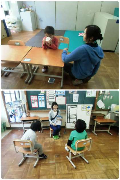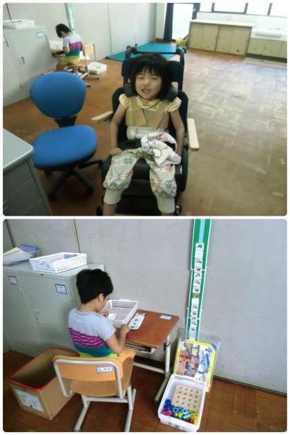 朝の会で今日の予定を確認していたり,朝の会が終わって個別課題学習をしていたり,休憩時間に友達同士のかかわり遊びを楽しもうとしています。