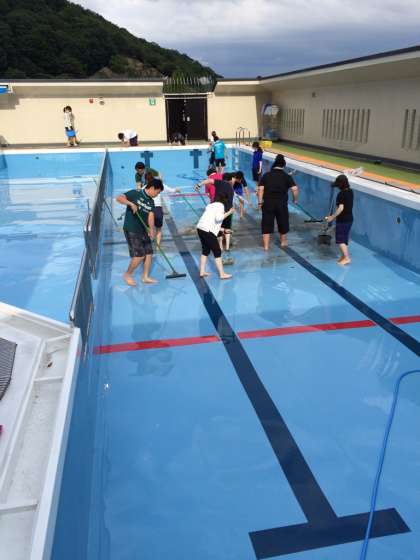放課後,屋上プール・中庭プールの清掃を行いました。