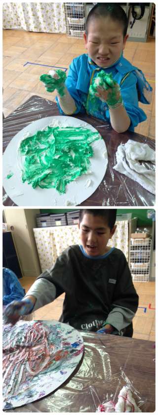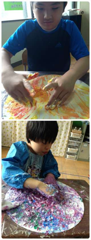 感触のよい素材に、児童たちも興味津々。自ら手を伸ばして創作活動に取り組んでいました。