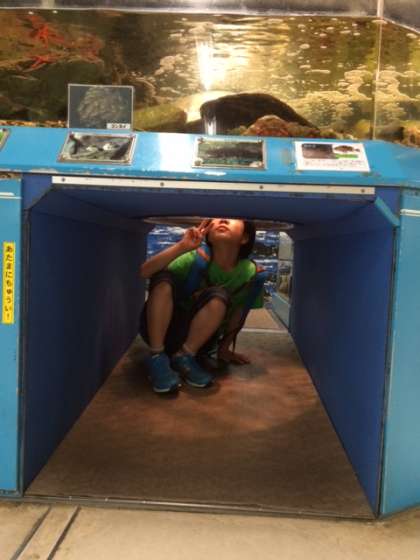 恐竜とにらめっこ,下から見る水槽。「何がいるのかな?」