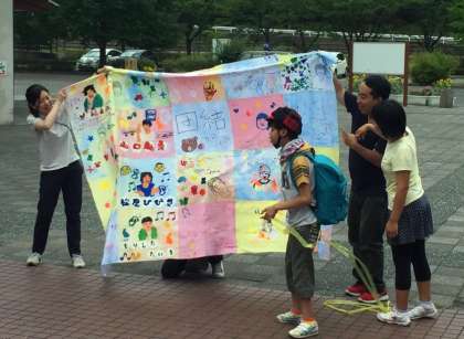 「ともだち讃歌」を歌った後、学年旗の披露です。