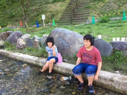 川遊びグループは青空の下、水遊びをしました。川の水はとても心地よく、涼を楽しんでいました。