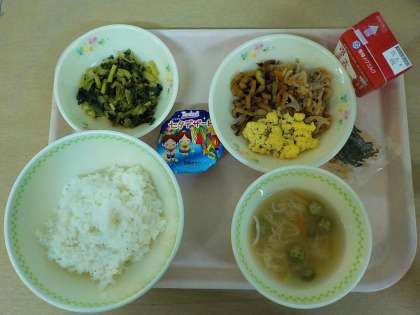 セルフで作る「あなご丼」と,天の川に見立てたそうめんと星形のオクラを浮かべたすまし汁「七夕そうめん」,デザートは七夕のイラストが描かれた巨峰ゼリーでした。