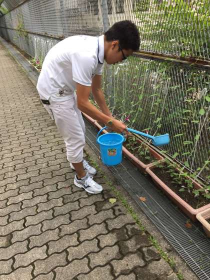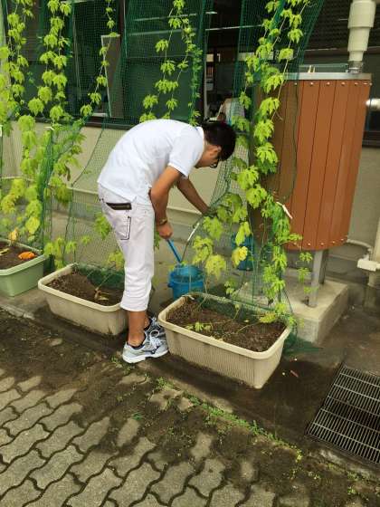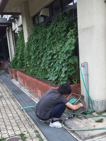 高等部 緑のカーテンに水をまいています