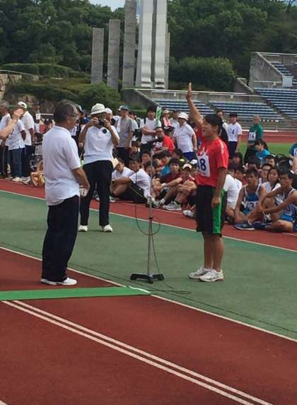 「我々,選手一同は,日頃,ご指導いただいている先生方や周りの支えのおかげで今があります。今日,こうして西京極陸上競技場でみなと競いあえることに,心から感謝し,オリンピックのような感動を再現できるように精いっぱい戦うことを誓います。」