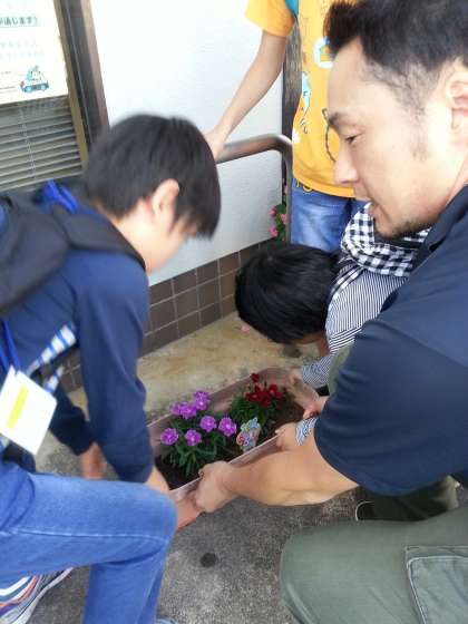 中学部【洛西ユニット】では灰方郵便局にお花を届けに行ってきました。紫と深紅の大輪のナデシコです。プランターに植えた花を台車に乗せて運びました。挨拶をする人,ラベルを渡す人,プランターを設置する人等,事前に分担された役割をしっかり果たすことができました。入口付近に置いてくださることになり,みんなでお礼を言って帰ってきました。バス停までの道中は列を作り,大原野の自然を満喫しながら歩きました。