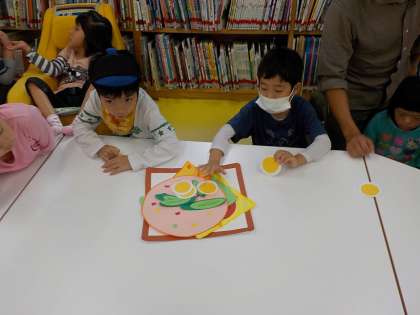 『サンドイッチサンドイッチ』という大型絵本を読んでもらったあと、みんなで大きなサンドイッチを作りました。