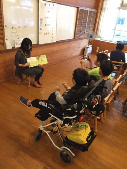 風船をいくつかビニール袋に詰めたものを1つの大きなボールと見立てて、椅子に座ってプレイします。ボランティアの方や保護者も一緒に、白熱したプレイとなりました。