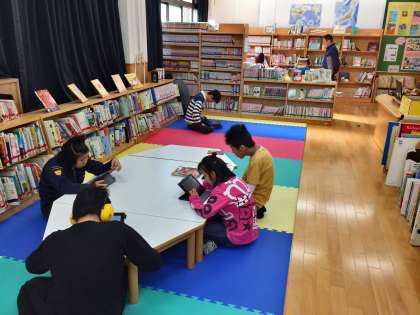 昼休みの図書館利用時間は,中学部・高等部が1時までで,小学部は1時15分までです。ゆったりした空間で,iPadを使ったり,リラックスした姿勢で本を読んだりして,ほっこりしたひと時を過ごしています。