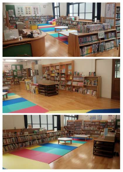 1階中棟の東端にある図書館の紹介です。授業時間の図書館での学習だけでなく,昼休みにも多くの子どもたちが図書館を訪れ読書を楽しんでいます。ゆっくり落ち着いて読書ができるようにテーブルやクッションチェアも置いてあります。