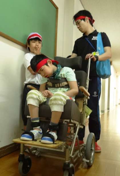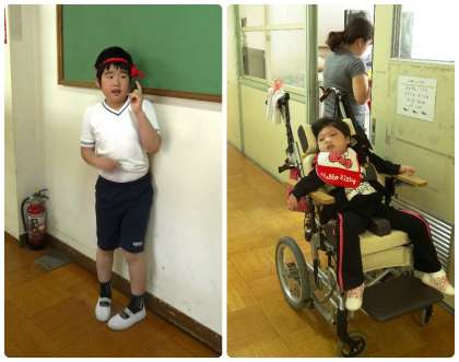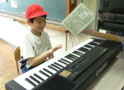 小学部4年生が体育館での体育の部の練習前に廊下で友達が揃うのを待っていました。「この子はキーボードが大好きです」と教えてもらったのでお願いしたら,快く笑顔でキーボードを弾いてくれました。
