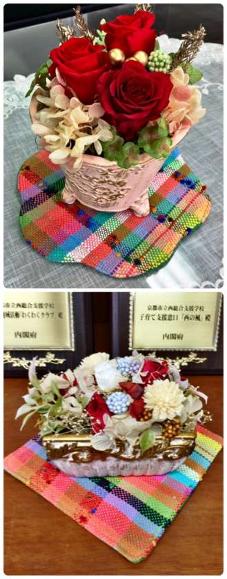 校長室に飾る鉢植えのコサージュをいただいたので,ワークスタディ布加工班にコザージュの下に敷く敷物を発注しました。