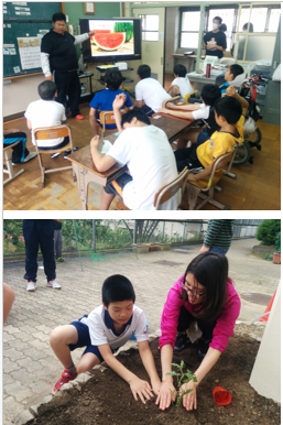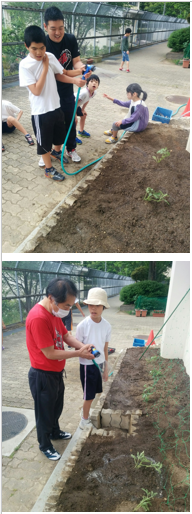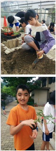 スコップで土を掘る係、苗を植える係、水やり係など係分担をして、スイカを植えました。夏休み前には、できたスイカをみんなで食べたいです。