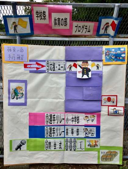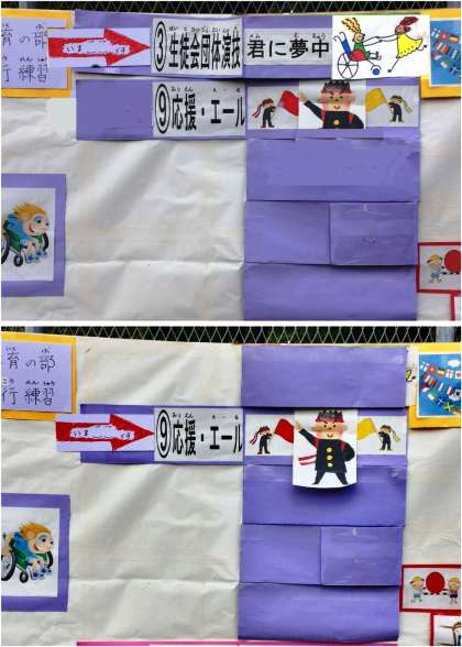 学校祭体育の部で,演技・競技の進行が子ども達にわかりやすいようにプログラム提示を工夫しました。終わった演技・競技は見えないようにして,矢印で進行中のものを示しています。