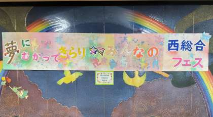 今年度のフェスティバルのテーマ「夢にむかってきらり☆彡みんなの西総合フェス」の横断幕を、児童生徒会合同で創り上げました。テーマのようにみんなが輝くフェスティバルとなりますように。横断幕は玄関を入ったところに掲示してあります。ご来校の際はぜひご覧ください。