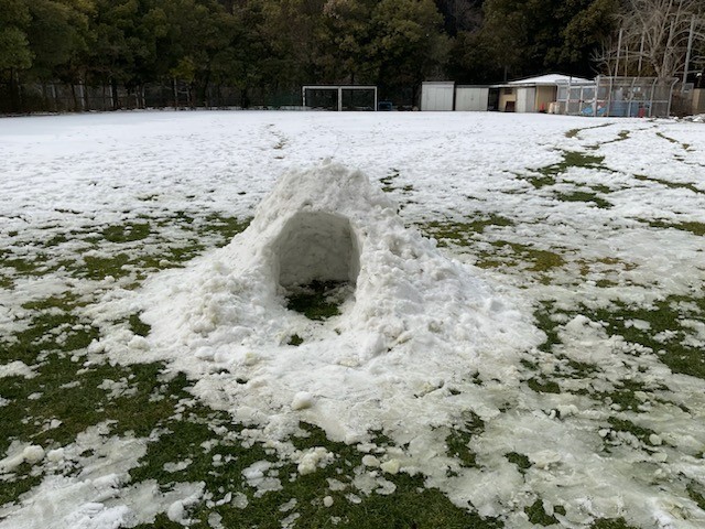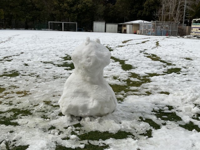 先週の雪の残雪でグラウンドに大きな雪だるまやかまくらを高等部の子どもたちが寒さに負けずワクワクしながら作りました。